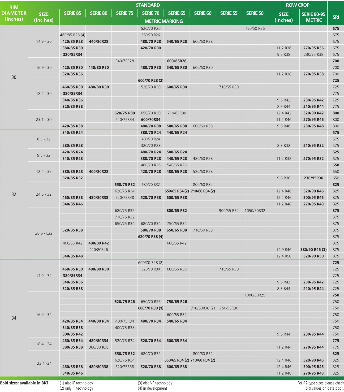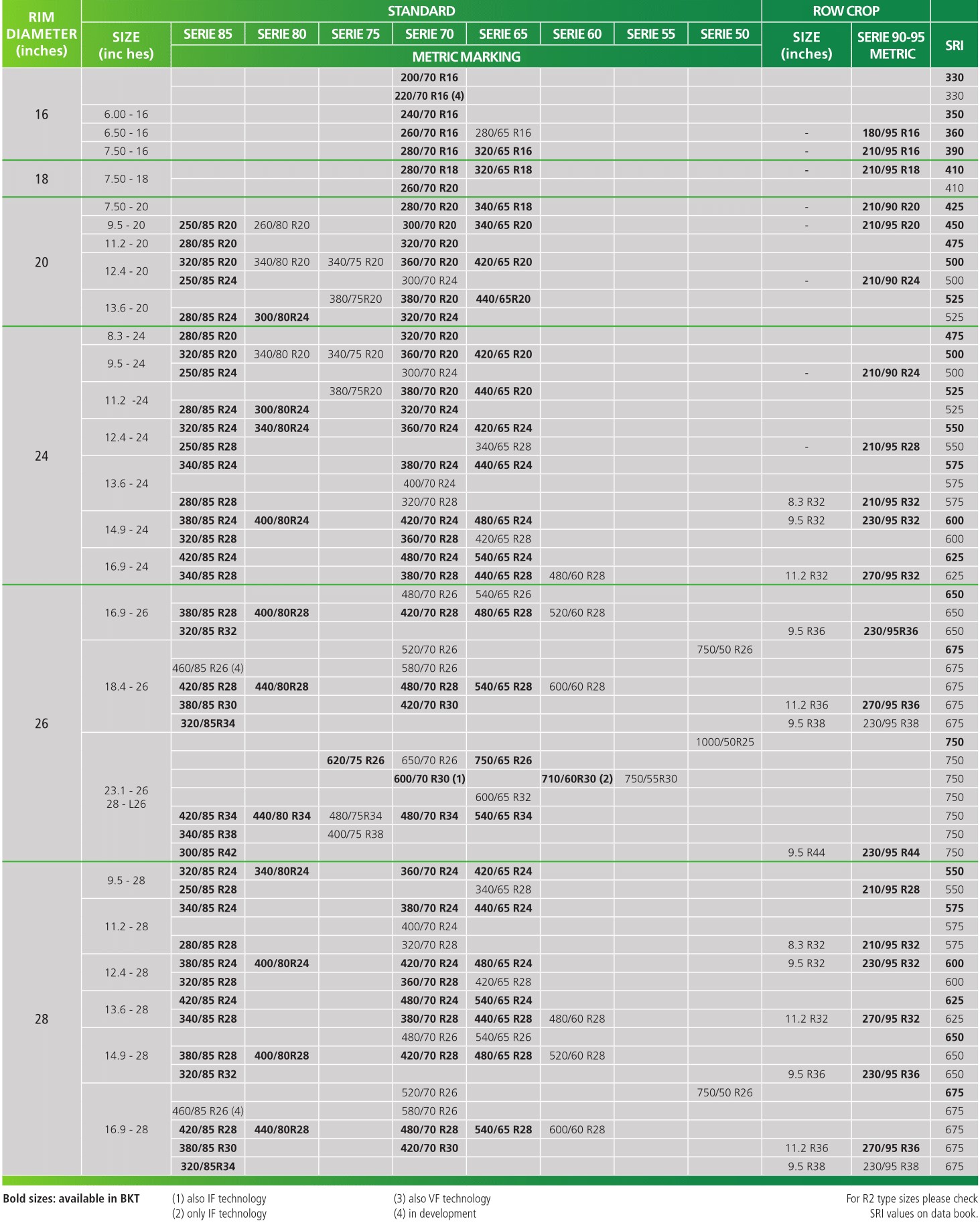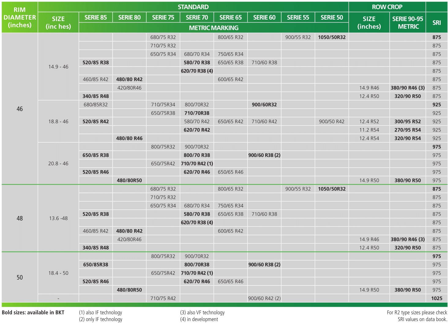 Circunferência de rodagem (CR): a distância coberta em uma volta completa da roda com tração sob as condições de carga e pressão indicadas na tabela.